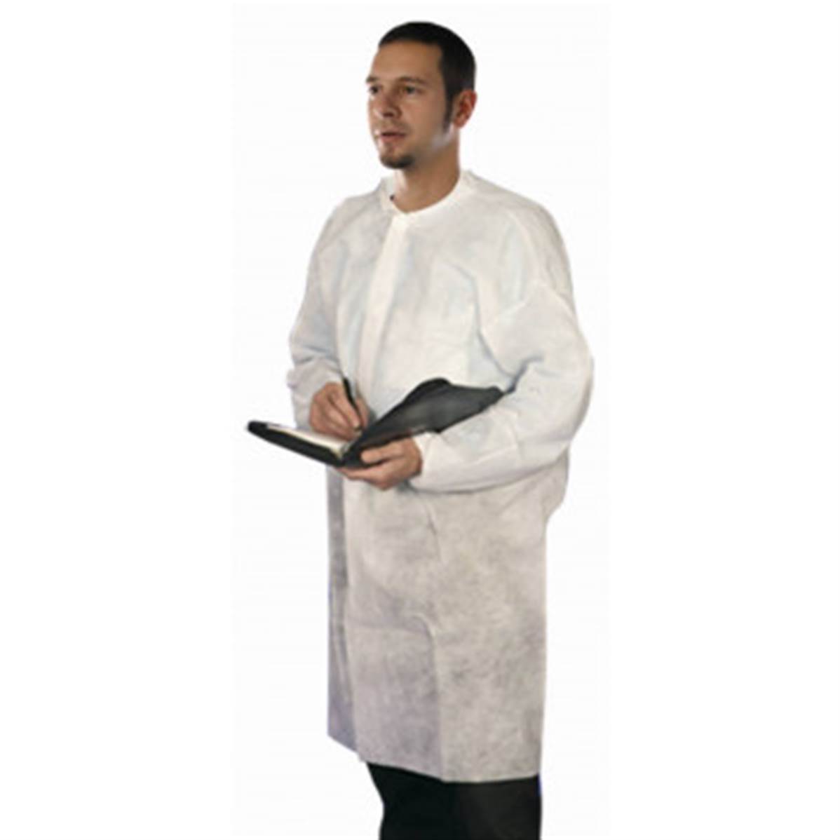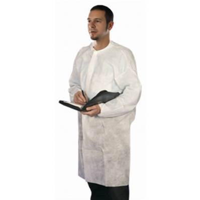 Camice monouso in tnt - polipropilene (30 gr/ m²) con allacciatura in velcro, traspirante, polsini con elastico.