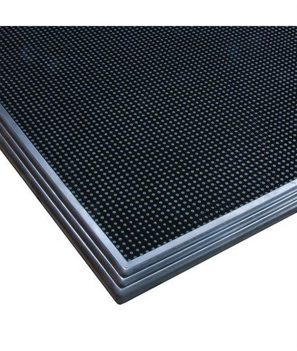 Tappeti consigliati per gli ingressi in tutte le aree alimentari; puliscono e disinfettano le calzature in modo eccellente. Al passaggio, punte di gomma si piegano sotto pressione per immergere le suole in una soluzione disinfettante: una duplice azione che impedisce alla contaminazione di raggiungere le aree di trattamento alimentare. Le dimensioni dei tappetini si adattano alla maggior parte degli ingressi. La presenza di ventose sulla parte inferiore ne impedisce lo scorrimento. Dotati di uno spesso bordo di contorno sollevato rispetto alle dita raschiatrici, per il contenimento del liquido disinfettante. Realizzati interamente con una mescola di gomma naturale e nitrile resistente per applicazioni generiche; progettati per resistere alla maggior parte delle sostanze chimiche e agli sbalzi termici.